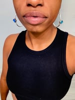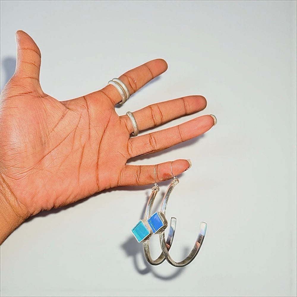 Chunky half round crescent sterling hoops with blue and turquoise glass accents.