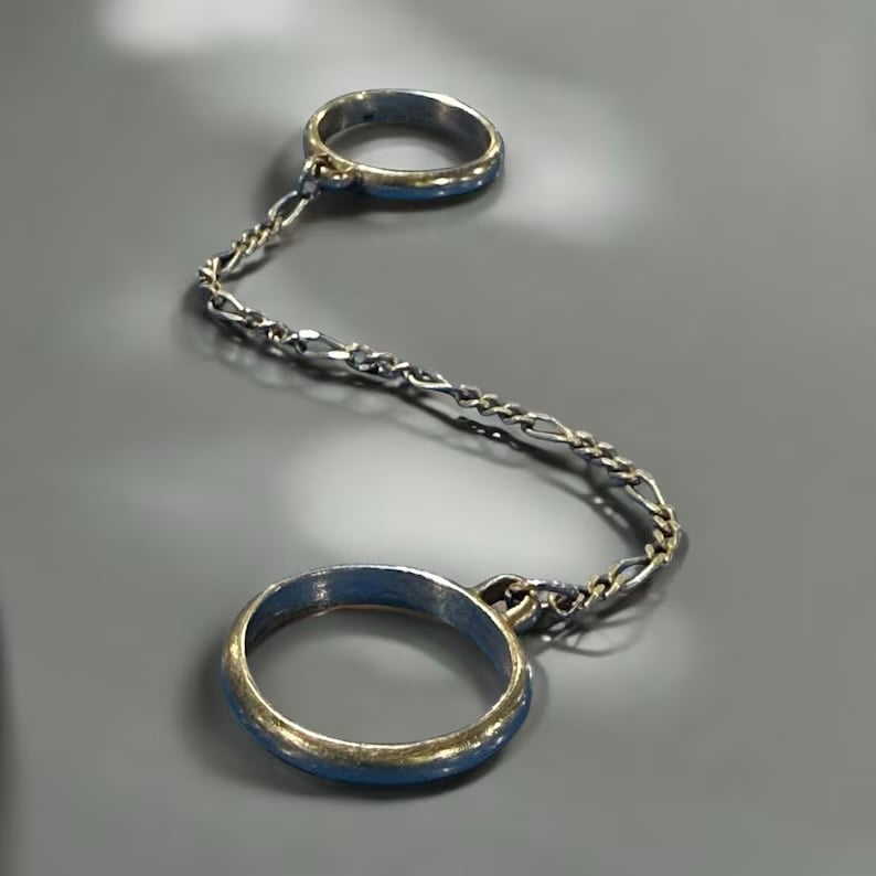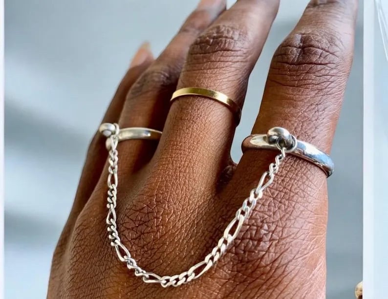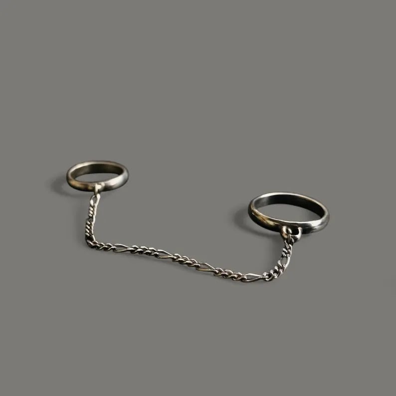 Two Sterling Silver Ring Bands linked by a dangling Figaro Chain.