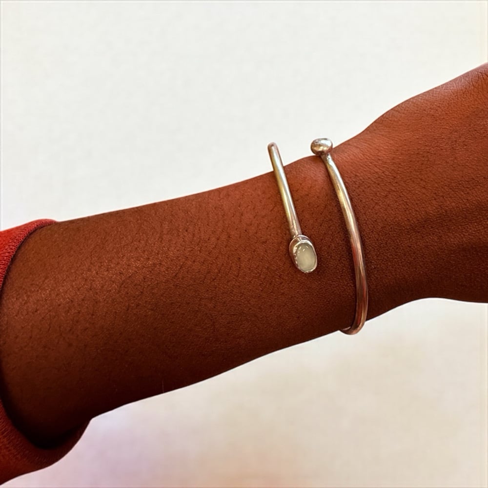 Part of the MoonWave Collection, a series shaped by moonlit waters, shifting tides and the quiet strength found in flow. Each cuff is handcrafted by me with 925 sterling silver and natural aqua chalcedony, a stone known for it's soothing, wave like energy. Its soft blue glow mirrors the ocean under moonlight, a reminder to move with rythm, trust the currents and let yourself be carried toward new horizons.