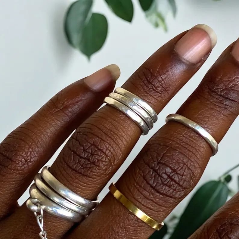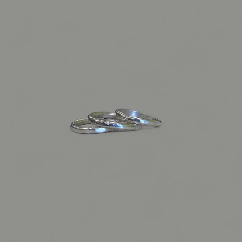A set of three slim sterling silver rings made to be worn on your mid finger. Lightweight, slightly hammered, and perfect for stacking or wearing solo. Each ring is handmade and may vary slightly in shape and texture.